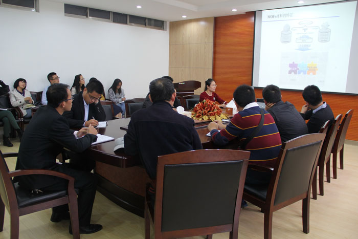 交流会上,杨秀丽博士首先介绍了金属-有机框架(MOFs)材料的研究背景和发展历程,系统概述了MOFs材料众多的应用领域,接着以催化应用为切入点,通过其本人的研究成果层层递进地介绍了如何设计新型功能MOFs材料并将其成功应用于催化领域。最后,杨秀丽博士结合新型环保重点实验室的发展方向,提出了通过MOFs材料对温室气体CO2进行捕获吸附和催化转化的解决方案,并与到场的嘉宾和同学们就MOFs材料的催化活性如何调控,以及如何利用MOFs材料特殊的框架结构合成多孔纳米材料的问题展开了热烈的讨论,将整个活动的气氛推向了高潮。