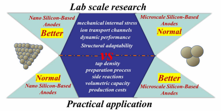 图1 纳米级与微米级硅材料在实验室研究阶段和产业应用上的优缺点对比。