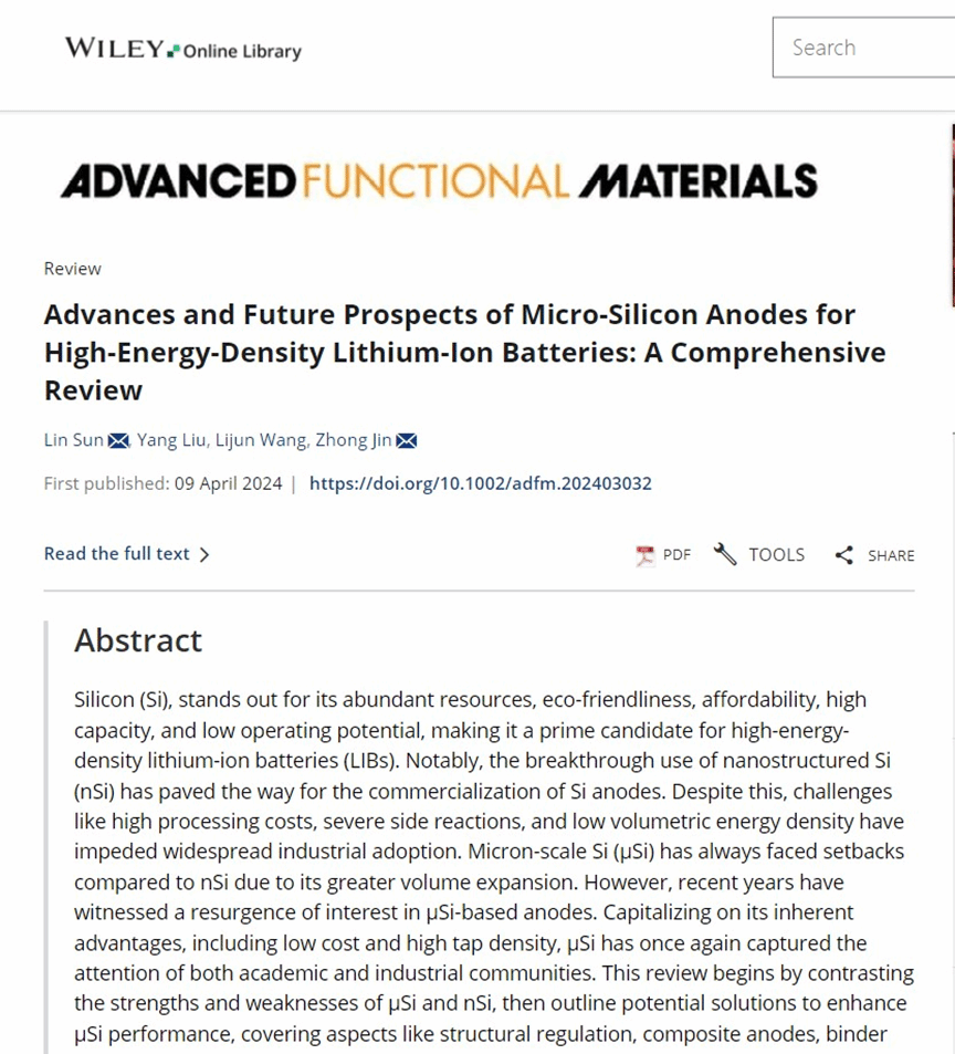 近日,我室孙林博士在国际顶级期刊《Advanced Functional Materials》(中科院一区top,影响因子:19)上以第一/通讯作者身份,盐城工学院为第一单位发表了题为“Advances and Future Prospects of Micro-Silicon Anodes for High-Energy-Density Lithium-ion Batteries: A Comprehensive Review”的综述论文,文章链接为https://onlinelibrary.wiley.com/doi/10.1002/adfm.202403032。该论文是我校在国际重要影响力期刊上发表高水平论文的又一次重大突破。