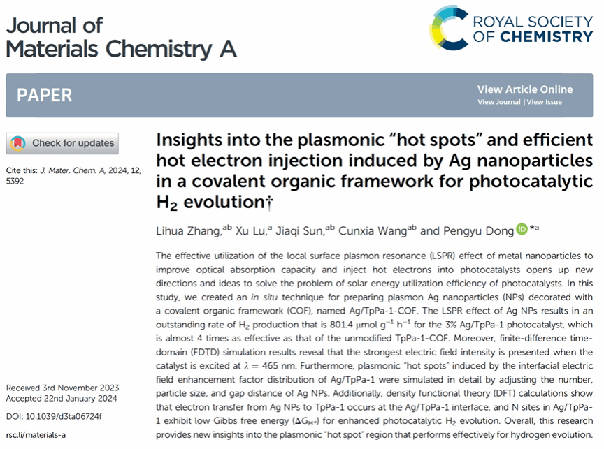 近日,以我校研究生张莉华为第一作者、董鹏玉教授为唯一通讯作者、盐城工学院为唯一单位的研究论文“Insights into the plasmonic “hot spots” and efficient hot electron injection induced by Ag nanoparticles in a covalent organic framework for photocatalytic H2 evolution”在材料类顶级期刊《Journal of Materials Chemistry A》(2024, 12, 5392-5405)上发表。《Journal of Materials Chemistry A》是英国皇家化学会RSC旗下重要期刊,该期刊2023年影响因子为11.9,主要刊登能源与可持续材料化学领域高水平的研究成果,属于材料学科Top期刊。