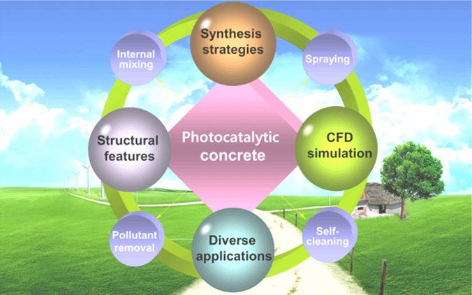 随着全球建筑行业的蓬勃发展和对环境污染问题的日益关注,开发既能提升建筑美学与耐久性,又能减少环境污染的绿色建筑材料成为了研究的热点。光催化混凝土作为一种新兴的环保材料,因其潜在的多功能性和环境友好性,正受到越来越多的关注。本论文综述了基于TiO2的光催化混凝土的最新研究进展。论文详细探讨了光催化混凝土的合成策略、种类、结构特性、多样化的应用以及计算流体动力学(CFD)模拟。本论文分析了制造光催化混凝土的主流技术(如内部混合法和喷涂法)的优缺点,并特别强调了TiO2基光催化混凝土的结构特性,包括钙硅酸盐水合物(C-S-H)凝胶与光催化剂之间的相互作用、碱性环境对光催化活性的影响、表面粗糙度以及长效性。此外,论文还介绍了TiO2基光催化混凝土的多功能应用,如氮氧化物(NOx)的去除、自清洁功能和挥发性有机化合物(VOCs)的光降解,以及其长期效率和生命周期成本分析(LCCA),并介绍了CFD模拟作为一种有效的工具,被用于监测和分析光催化混凝土周围污染物和空气的流动,模拟真实条件。本论文不仅总结了当前基于TiO2的光催化混凝土的研究进展,还提出了该领域面临的主要挑战和未来的研究方向,为绿色建筑材料的进一步开发和应用提供了重要的理论基础和实践指导,并为光催化混凝土的优化设计和实际应用提供了科学依据,有助于推动建筑行业向更加环保和可持续的方向发展。