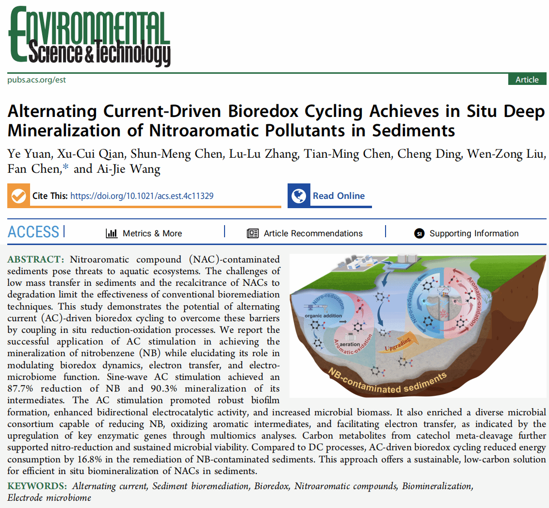 近日,我室远野副教授课题组在国际环境领域的顶级期刊《Environmental Science & Technology》(ES&T)上发表题为“Alternating Current-Driven Bioredox Cycling Achieves in Situ Deep Mineralization of Nitroaromatic Pollutants in Sediments”的研究成果(Environ. Sci. Technol. 2025, 59, 14497–14507)。远野副教授为第一作者,校外兼职硕士生导师、西北工业大学陈帆副教授为通讯作者,2023级研究生钱徐翠为第二作者。这是我校首次以第一单位在ES&T发表研究论文。ES&T创刊于1967年,由ACS出版,是国际环境领域最具影响力的顶级学术期刊之一,致力于报道环境科学与技术原创性、突破性的研究成果,以其卓越的学术质量和广泛的国际影响力而著称,2024-2025最新影响因子为11.3。